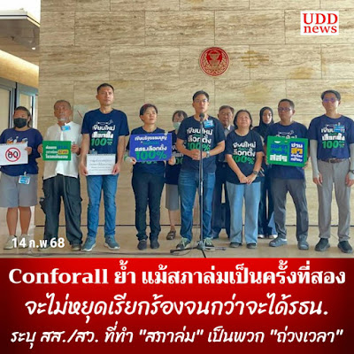 14 กุมภาพันธ์ 2568 เวลา 11.50 น. ที่ศาลาแก้ว รัฐสภา เครือข่ายประชาชนร่างรัฐธรรมนูญ (Conforall) แถลงข่าวกรณีสภาล่มครั้งที่สองและทำให้การอภิปรายและลงมติร่างแก้ไขรัฐธรรมนูญ